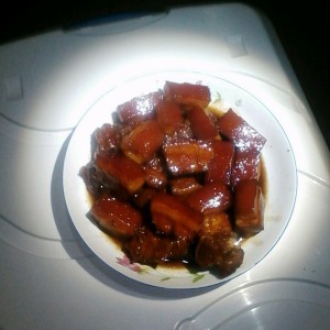 锅里放少许油把冰糖放进去练成酱油色把五花肉放进去,煸炒出油然后放入老抽酱油,再次煸炒一到两分钟,再加入姜片,八角,香叶,山楂干,翻炒均匀,加入高汤刚好莫过五花肉小火炖至二十分钟,改为大火收汁