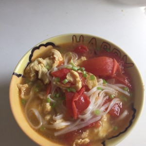 6. 将面盛出,再将西红柿鸡蛋汤盛入碗内,可以再撒上些香葱提色。