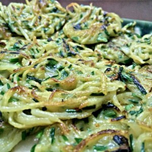 平底锅放油烧热,用筷子顺时针搅起一小团儿土豆丝放锅里,稍作整理,使面团变成小圆饼。煎至两面金黄就可以出锅啦!野韭菜简直香死个人呀!好看又好吃,还超简单哦!