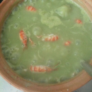洗米放保加鱼杂汤加小龙虾猪一起煮