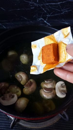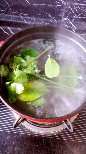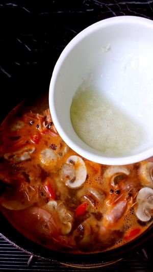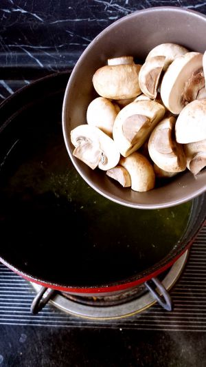 煮20分钟后,把料包和香菜柠檬叶都取出不要,放入口蘑