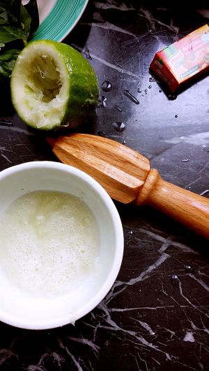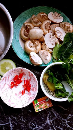口蘑对半切,小米辣切段,姜切片,柠檬叶香菜洗净,青柠檬对半切一会榨汁