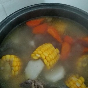 先把泡好的排骨放到锅内煮半个小时,在加入切好的山药,玉米,胡萝卜,再煮半个小时~