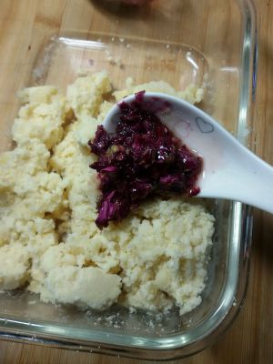 最后加入用蜂蜜泡好的玫瑰花搅拌均匀。
