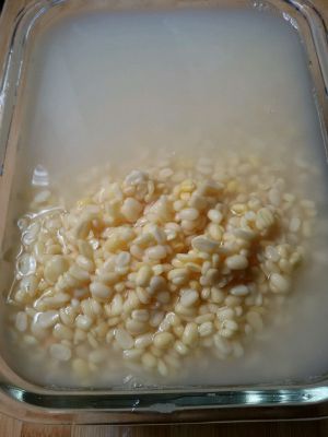 加适量清水浸泡6小时左右(如果没有去皮绿豆,可将带皮绿豆放清水浸泡过夜至第二天绿豆发胀,再用双手轻搓绿豆皮自然脱落,过水冲洗掉绿豆皮即可)。