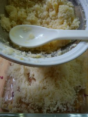 将蒸熟的绿豆晾凉,取网筛放入绿豆,用勺子压碎过筛。