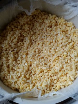 将泡好的绿豆沥去水分放入铺有纱布屉上。
