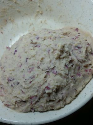 把过筛好的绿豆蓉加入适量炼奶搅拌。