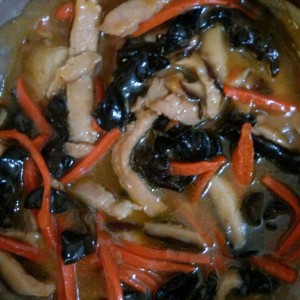 油热先放肉下去油煎,待淀粉定型不散加入蘑菇,蘑菇要早点煮才能煮出水。依次放入胡萝卜和黑木耳。待菜熟加入调好的淀粉水,烧好收水即可。