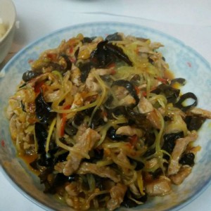 重新起锅,倒油,这次多油,下肉丝,炒变色之后拨到锅的一旁,把葱姜蒜泡椒的料倒入炒熟再混合肉丝。再放一点红油豆瓣,糖,醋少许,再倒入已断生的青笋丝和木耳丝。翻炒之后放点盐,就好了~