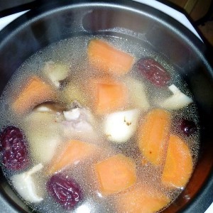 把材料一起放入锅中,可以先放排骨,确保能煮熟,再放胡萝卜,然后是山药和香菇,这两个比较容易熟。加入几个红枣枸杞,放点八角、桂皮(一点点就可以,不然味道很重),淋点油,然后盖盖子让它煮着就可以。一个小时左右就可以了。