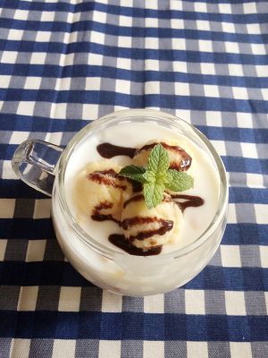 用冰激凌勺挖三枚冰激凌,挤上少许巧克力酱,薄荷叶点缀。