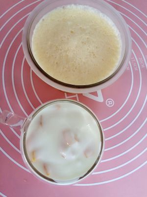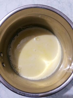 将蛋黄糊倒入牛奶中,用小奶锅在电磁炉以最小火加热至五成热即可,要不断搅拌。如果在明火上加热,就采用隔水加热法加热。蛋奶糊加热后变得略有些稠了。