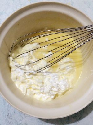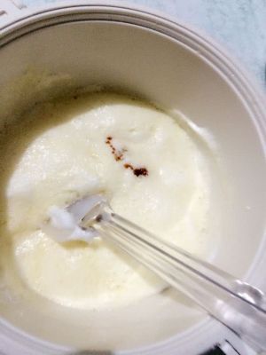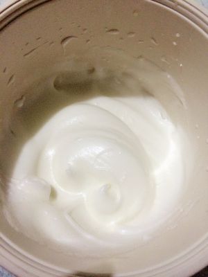 将10g的白糖加入到淡奶油中用打发蛋清的方法,将奶油打发。一定要先将打发的淡奶油分两次加入的放凉的蛋奶糊中,搅拌均匀后再分三次加入打发的蛋清。