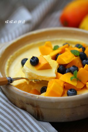 砂锅静置常温后放入冷藏室至完全凝固。取出放上芒果泥和蓝莓就完成啦!*\(^o^)/*应季的消暑美味甜点!