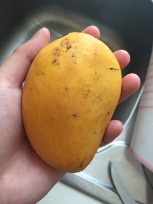 这个大小的芒果,一个取肉打成泥过筛去杂质备用。两个取肉块做装饰