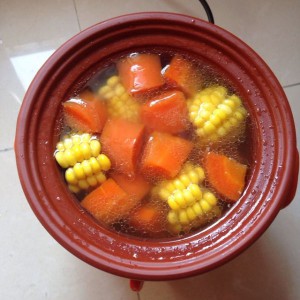 沸腾后加入胡萝卜玉米,再次沸腾后换成小火。
