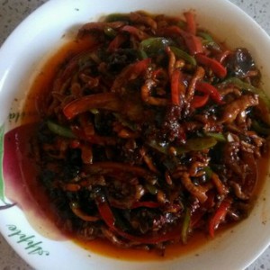 热锅下油放入肉丝翻炒,肉丝颜色稍微翻白下豆瓣酱煸炒,炒出红油下青红椒、木耳继续煸炒,下调好的汁翻炒,临出锅放入香油,出锅