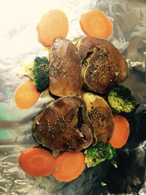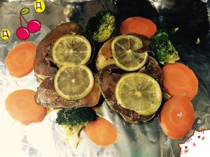 铺上锡纸,刷上一层橄榄油,放上腌制好的鳕鱼块,摆上西兰花和胡萝卜