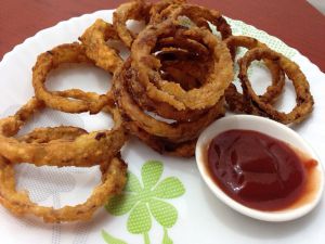油烧至六层热,洋葱圈炸到金黄色即可。