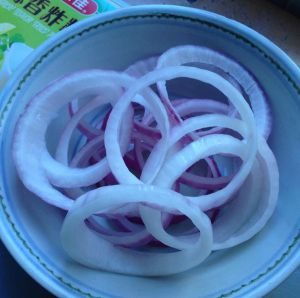 洋葱选拔层外皮,切掉头尾再横切,切时熏得我眼泪哗啦啦—_—||