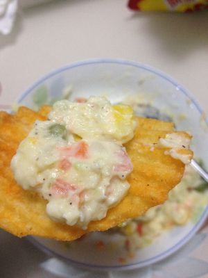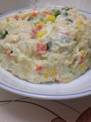 熟配料与捣好的土豆泥混合,根据自己喜好加沙拉酱搅拌均匀,撒上黑胡椒,本人偏爱丘比特香甜味沙拉酱,另外加了一小勺千岛沙拉酱调味~