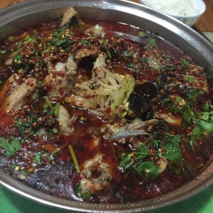 把煮好的大头菜、木耳、黄豆芽一起放进另外一个煮锅里,把煮好的鱼块连汤和鱼一起倒入煮锅里,切好的香菜段放在上面,均匀的撒上辣椒片,三勺豆油烧开,用大勺把热油淋在盛好鱼的锅里。美味的水煮鱼完成啦