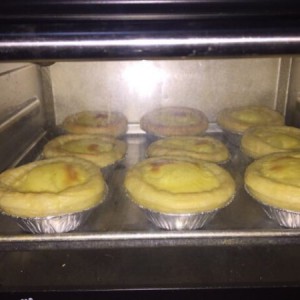 放入烤箱,我家是长帝迷你烤箱,温度较高,我就200度,放在底层,25分钟,你可以在旁边看,看到蛋挞皮起酥了,变色了,有虎斑了,不冒泡了,就可以关了。