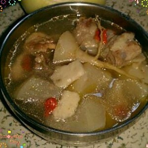 排骨飞水,萝卜带皮洗净切滚刀块,云苓、枸杞稍微泡下水