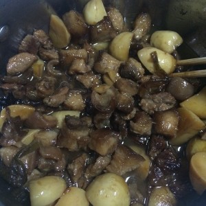 然后准备土豆,全部切块,大小合适就可以,锅里水烧到你可以看见一半的肉的时候下土豆,然后翻炒一下,小火炖至收汁,尝一下咸的味道不够可以加一点盐(味道是有了下次换五花再来一次)