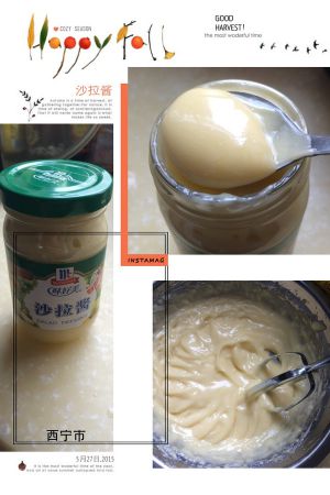 打发好的蛋液一点点添加食用油、每次不宜超过20ml、添加一次就要搅拌到完全容合再继续添加!几次三番蛋液就会变浓稠、滴入一些白醋搅拌就会稀释一些、再重复添加油、交替进行直到油和醋添加完成!沙拉酱就完成了