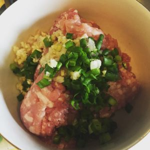 五花肉绞成肉末,放入葱花干葱末蒜末。(如有咸鱼,加入肉馅,味道更佳)放入调料:蚝油、盐、生抽、香油或花生油,(如有叉烧酱放点更佳)拌匀!