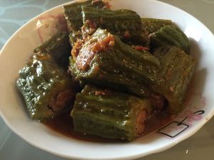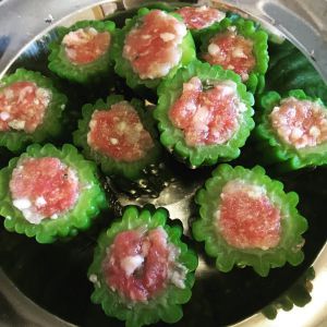 将肉馅酿入焯水后的苦瓜里后,锅里下油,下蒜末,炒香,放入生抽蚝油盐,如果怕太苦可放点糖,苦瓜下锅,与酱料一起翻炒,加入刚好过苦瓜面的水,盖上锅盖开始焖,刚开始可用大火!