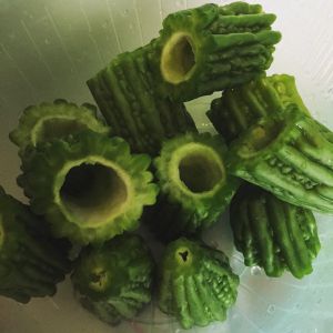 将苦瓜洗干净,切段,用铁勺子把籽去掉备用。锅里加水烧开,放盐,放苦瓜,待苦瓜颜色变了就捞起!