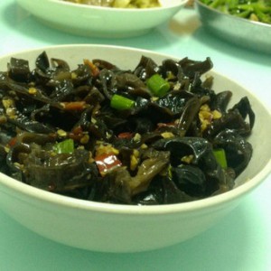 黑木耳用开水煮三分钟,沥干备用。热锅下油爆香蒜蓉,然后下剁椒,下香醋,生抽,盐适量,烧开后淋到黑木耳上。