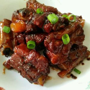 把排骨盛到盘里摆好,切点香葱叶点缀,糖醋排骨就做好了(有芝麻的可以放些芝麻点缀,就更好看了)