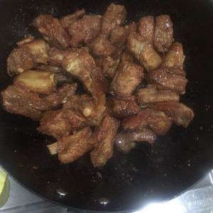 凉水抄放料酒30g,抄好后控干水份,锅里放入适量油加糖,我放的冰糖,小火化开后放入排骨上色,倒入腐卤汁