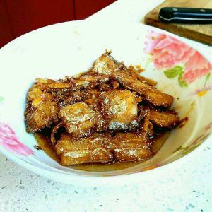 带鱼控干水,锅内加少许油,小火煎带鱼,煎致两面金黄。