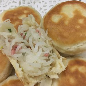 面加酵母、糖和水和成稍软点的面、揉匀后把面擀成薄片抹上油酥卷起来,下剂包入和好的萝卜丝馅即成生坯!