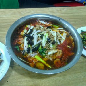 将锅里的菜全部捞出放入豌中,待水再次沸腾后,放入腌制好的肉片,煮30秒后捞出,将锅里的汤盛到豌中,放入花椒末和辣椒末和葱段。再次起锅,多放点油,放入切好的干辣椒段炒,油出香味后将油淋入肉片上,出锅!