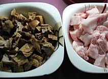 把泡好的笋干清洗干净,五花肉切小块。笋干很吃油水,必须得用五花肉才炖得香。