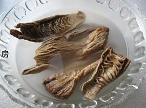 笋干取出几块用淘米水泡上。这个笋干很硬,最好泡一晚上。