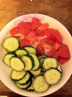 黄瓜切片,番茄切块。我一般都是头一天晚上切好。