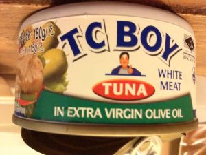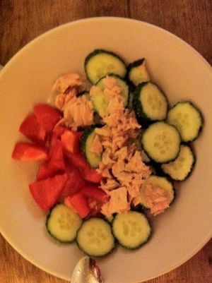 舀出金枪鱼罐头放入切好的蔬菜中。金枪鱼罐头中的橄榄油也倒入蔬菜中一些。