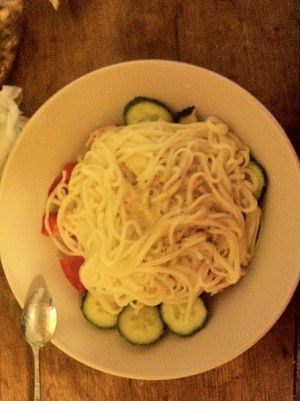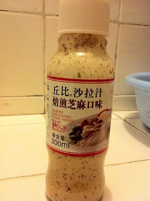 面煮好后,将面汤倒去,面放入蔬菜中(根据个人喜好,也可将面过一下冷水)。最后淋上沙拉酱,美味的早餐就ok了~