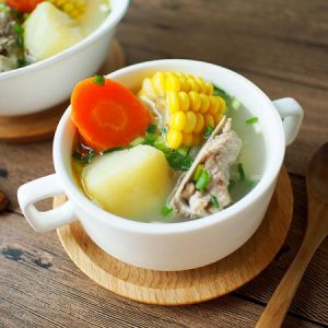 所有材料洗净,玉米切小块,胡萝卜、土豆切大块(胡萝卜土豆相对容易炖烂所以切大块一点好些)