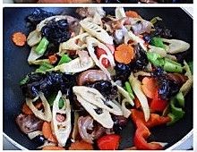 胡萝卜洗净,切片;青红椒洗净,去蒂和籽,切成块。竹笋泡发,洗净,切片。