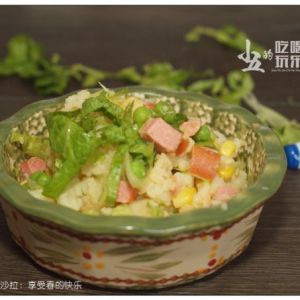 凉却后的土豆去皮,放进保鲜袋,用擀面杖压成土豆泥。