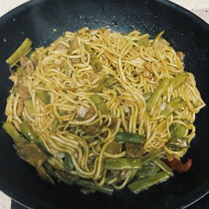 热锅,放油,热油,放肉翻炒。变色后,倒入扁豆继续翻炒,尽量让每一根扁豆沾过油。为啥,因为香呀!