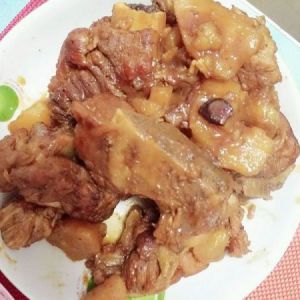 放入热水,酱油,老抽,盐,味素,土豆,文火炖,待肉烂后大火收汤即可